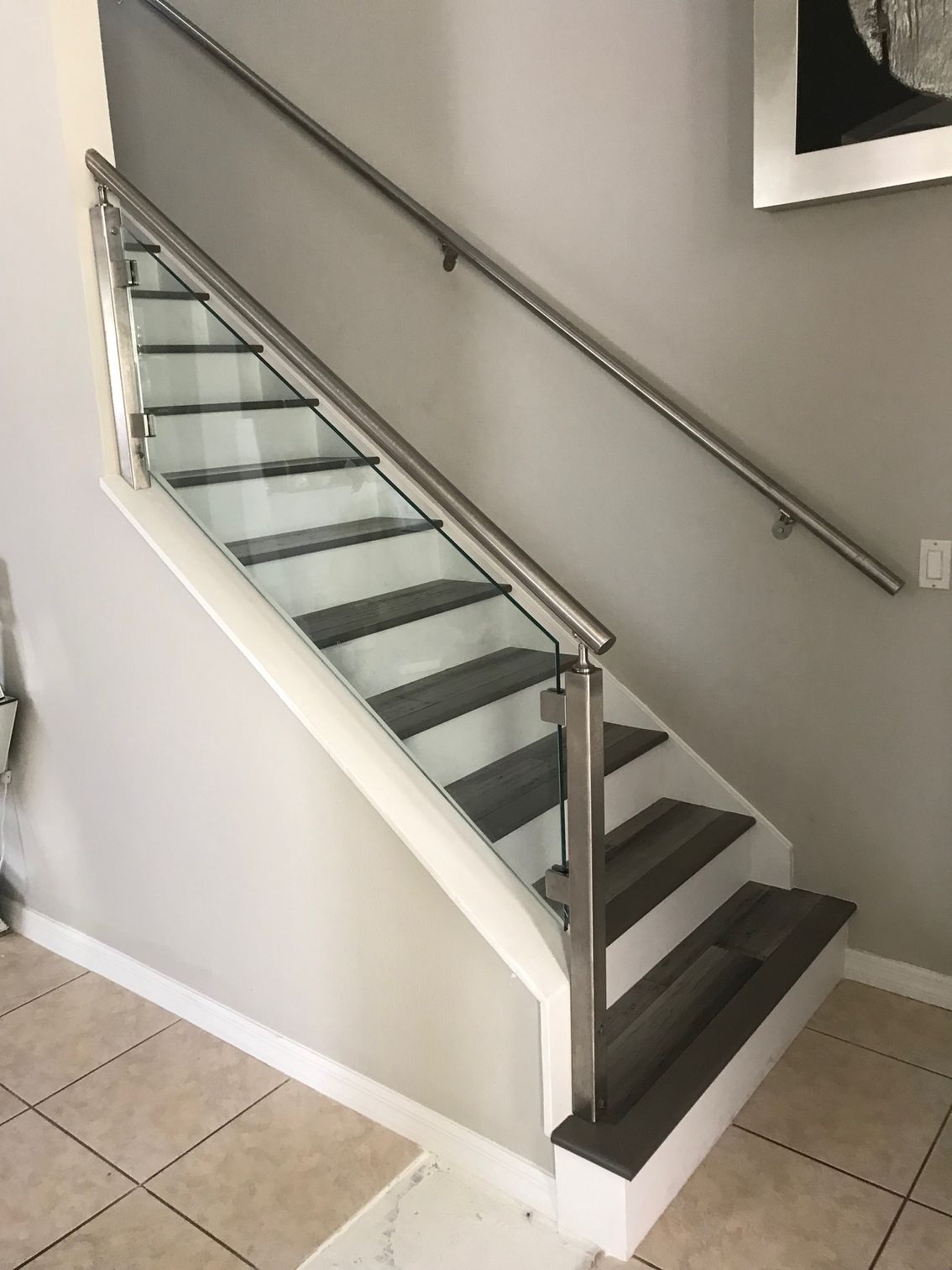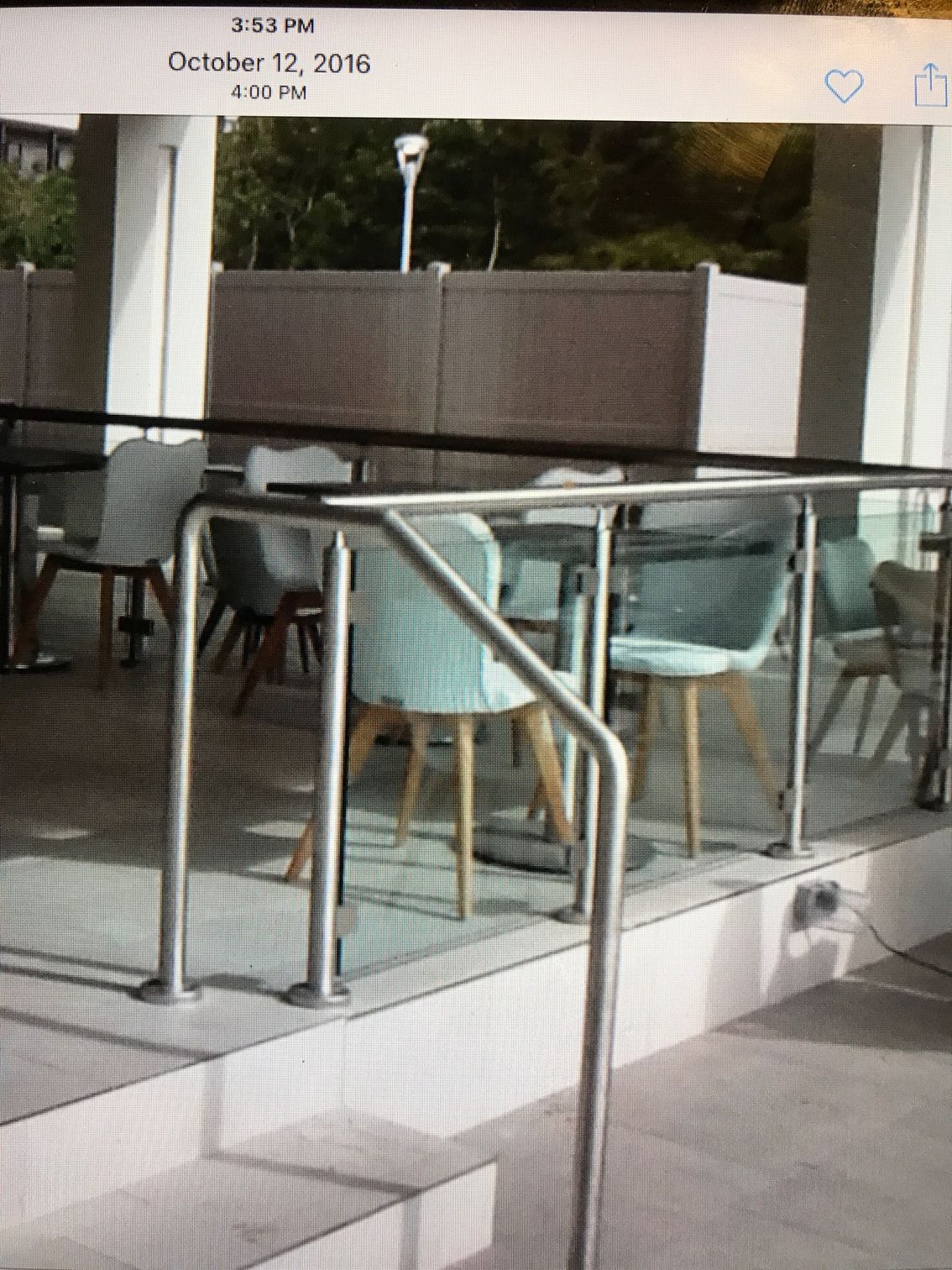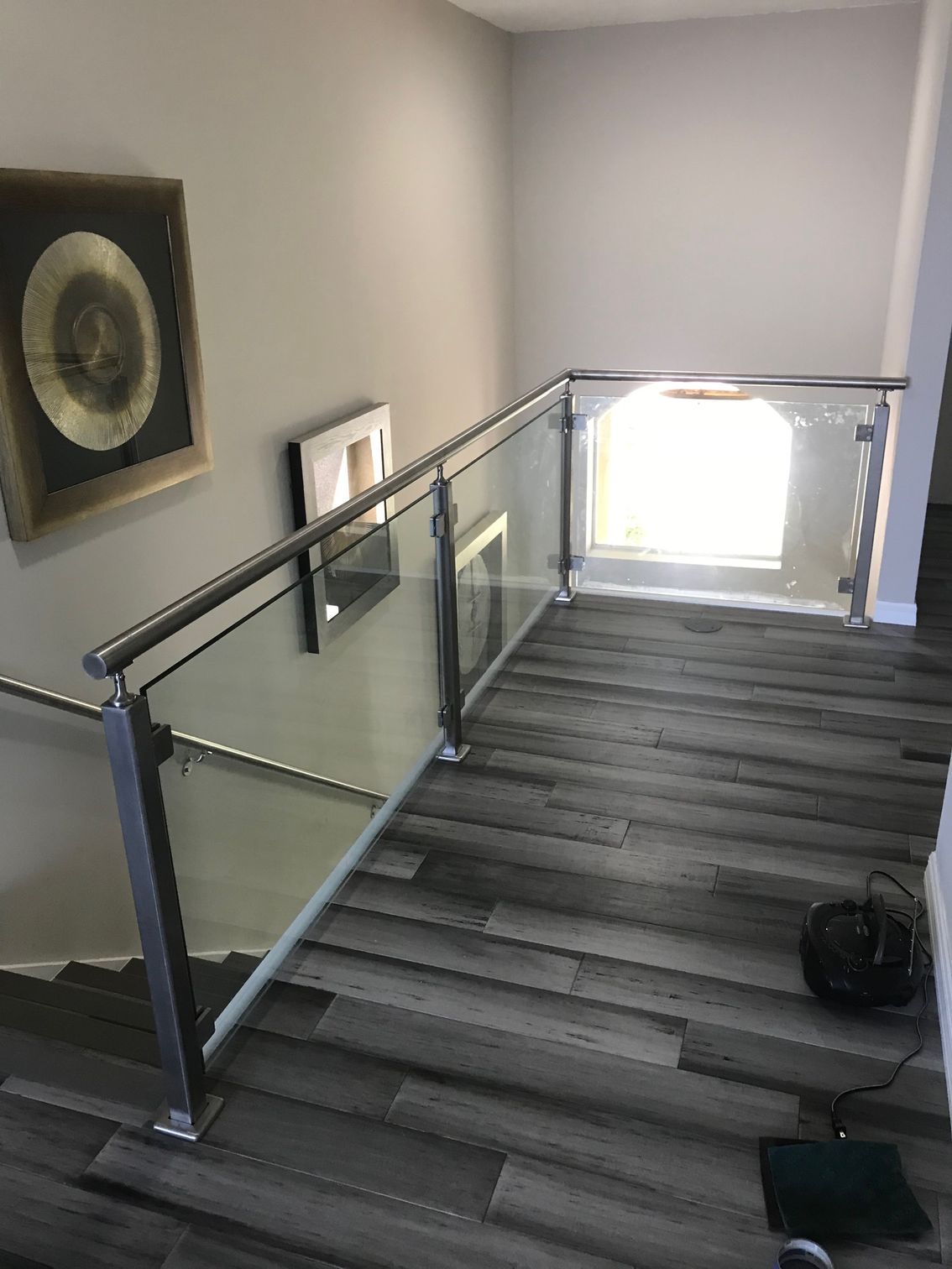 Custom glass railing, brushed stainless steel posts, facia spigot mount, cherry cladded facia , toe board and cap.