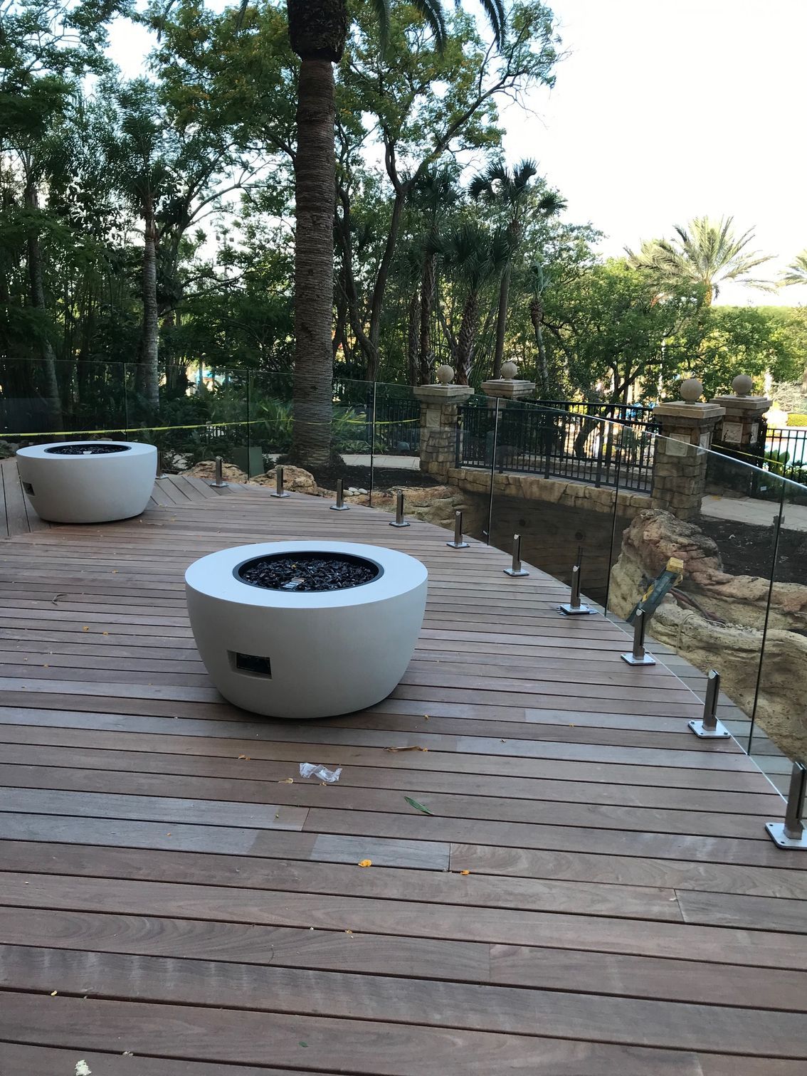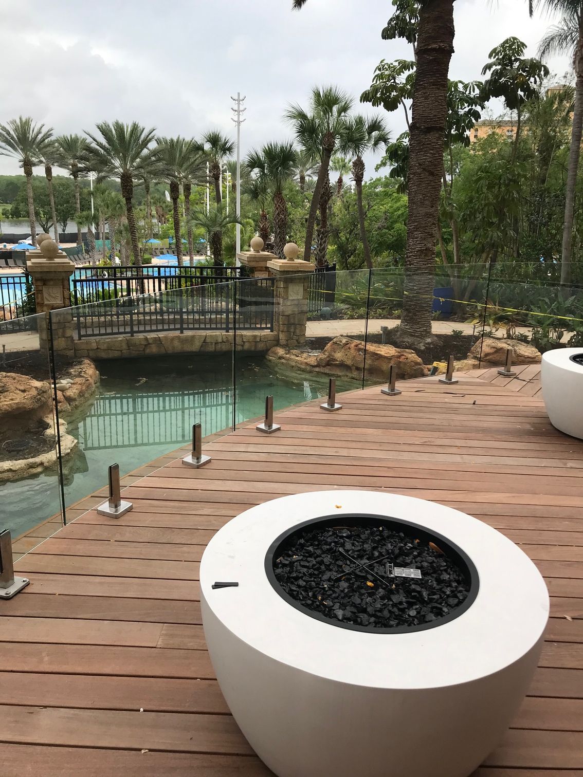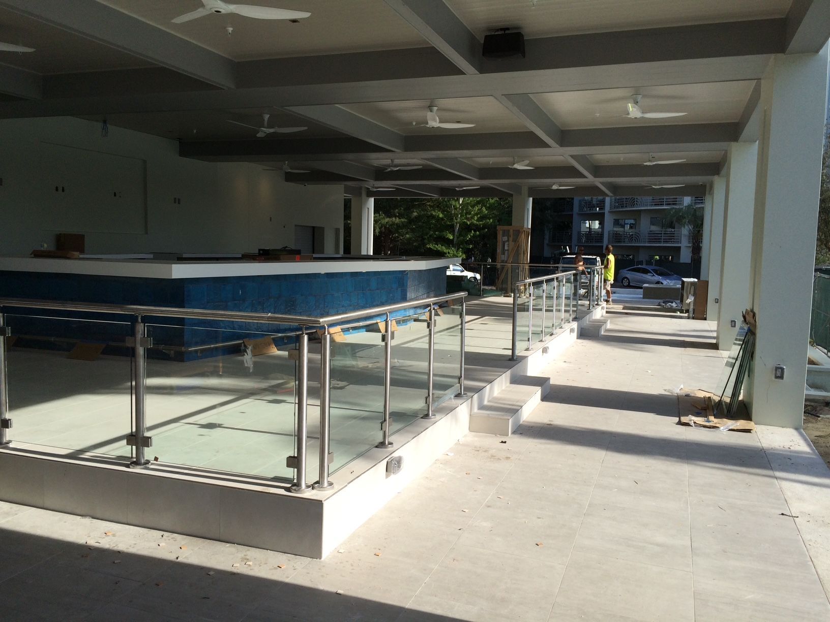 Custom glass railing, brushed stainless steel posts, facia spigot mount, cherry cladded facia , toe board and cap.