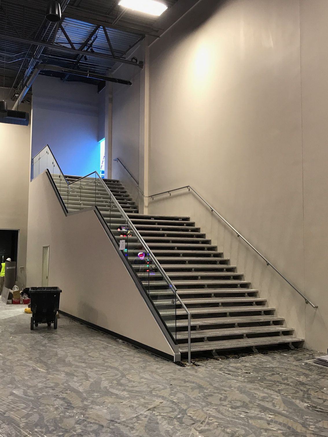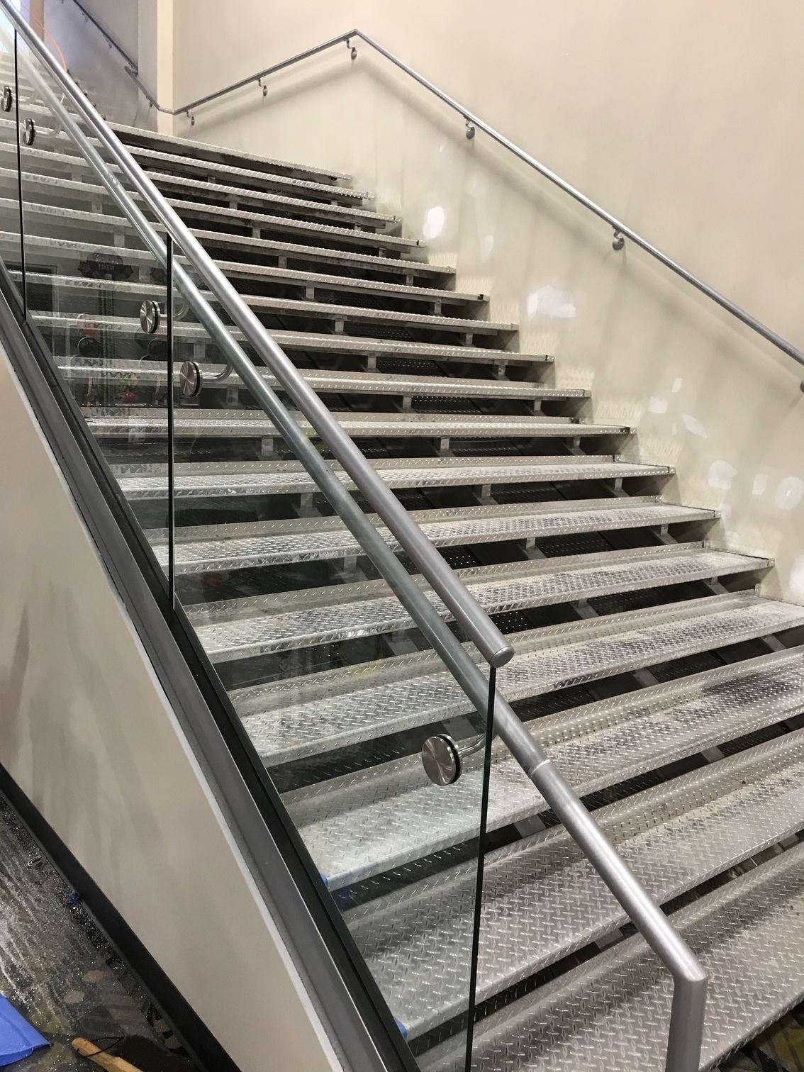 Steel curved stair with integral stringer bottom mount glass railing with "Floating" Terrazzo treads